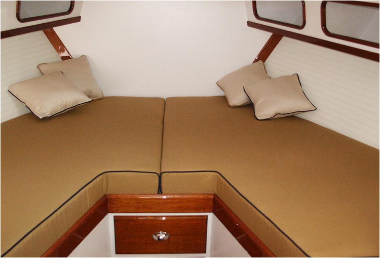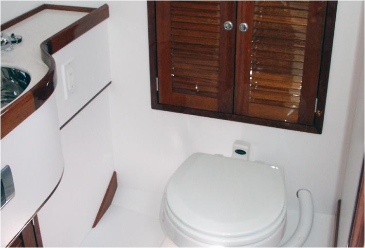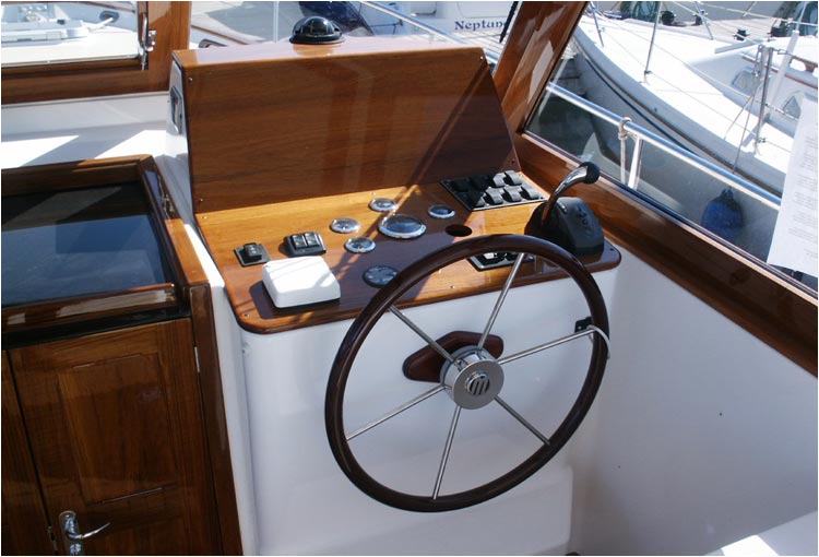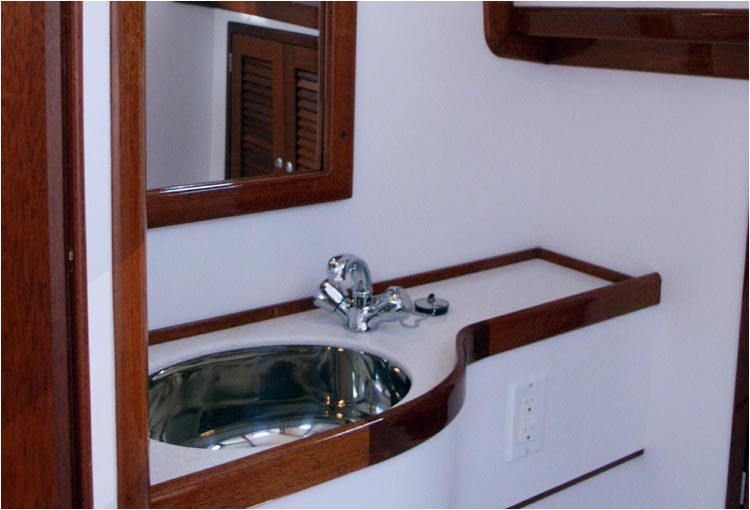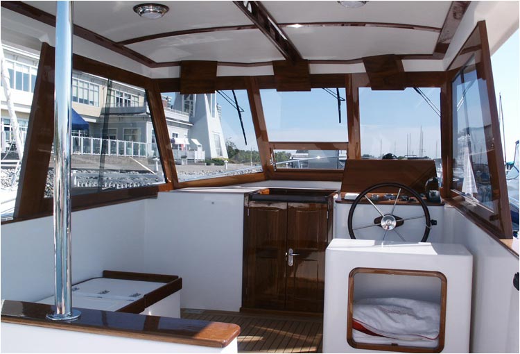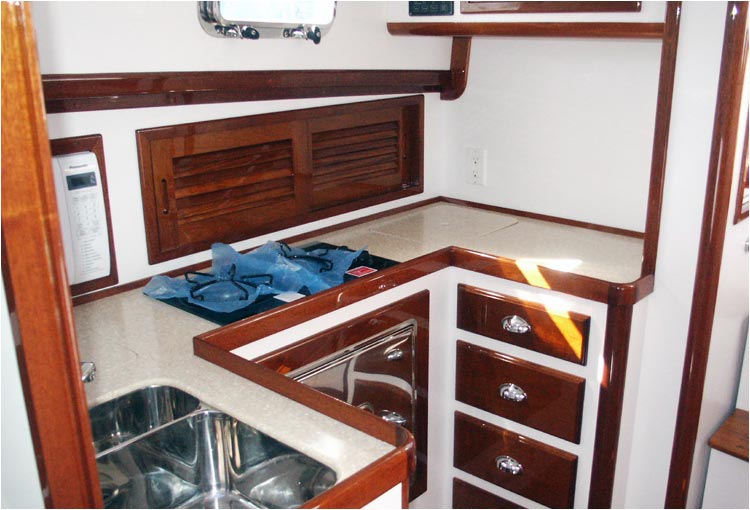 As one would expect from Bruckmann, a yard that is acknowledged to be in the top rank of North American custom builders, the interior of the Bruckmann 34e shows meticulous joiner detail in traditional gloss varnished mahogany against semi-gloss off white cabinetry. Customers for the 34 are encouraged to personalize their yachts through broad choices in interior layout, hardware and fabrics.